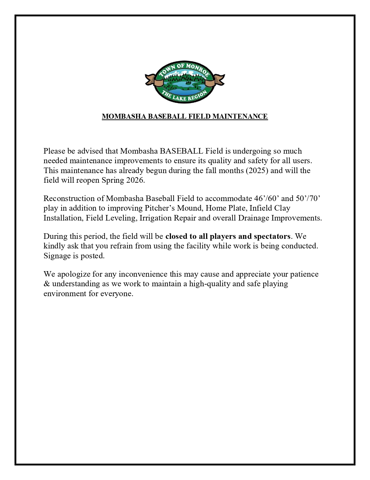 Mombasha Park was dedicated in 2007 to offer residents and guests a means of active and passive outdoor recreation. Operations and maintenance of the park is made possible through the Town of Monroe Maintenance and Highway Departments, Town of Monroe taxpayers, local athletic leagues, generous supporters and donors. Mombasha Park provides a place you can play baseball and soccer, walk along nature trails fashioned by the Boy Scouts, or play on the age-specific playground. The Park is open from 9:00 am-until dusk, seven days a week from April until December.
