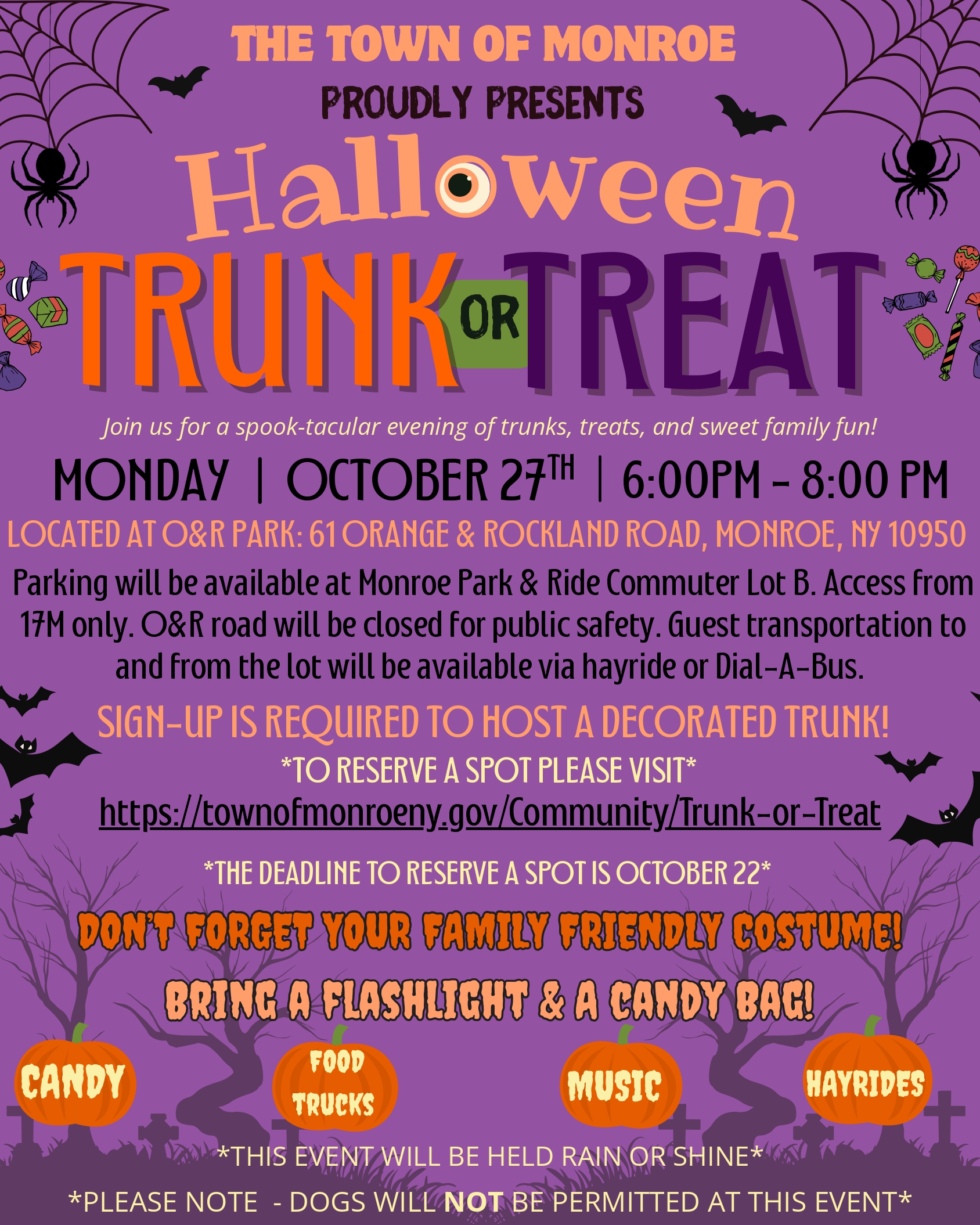 Calling all citizens, families, community groups, and organizations, the Town of Monroe will be holding its annual Trunk or Treat event on Monday, October 27, 2025! *This event is rain or shine.*