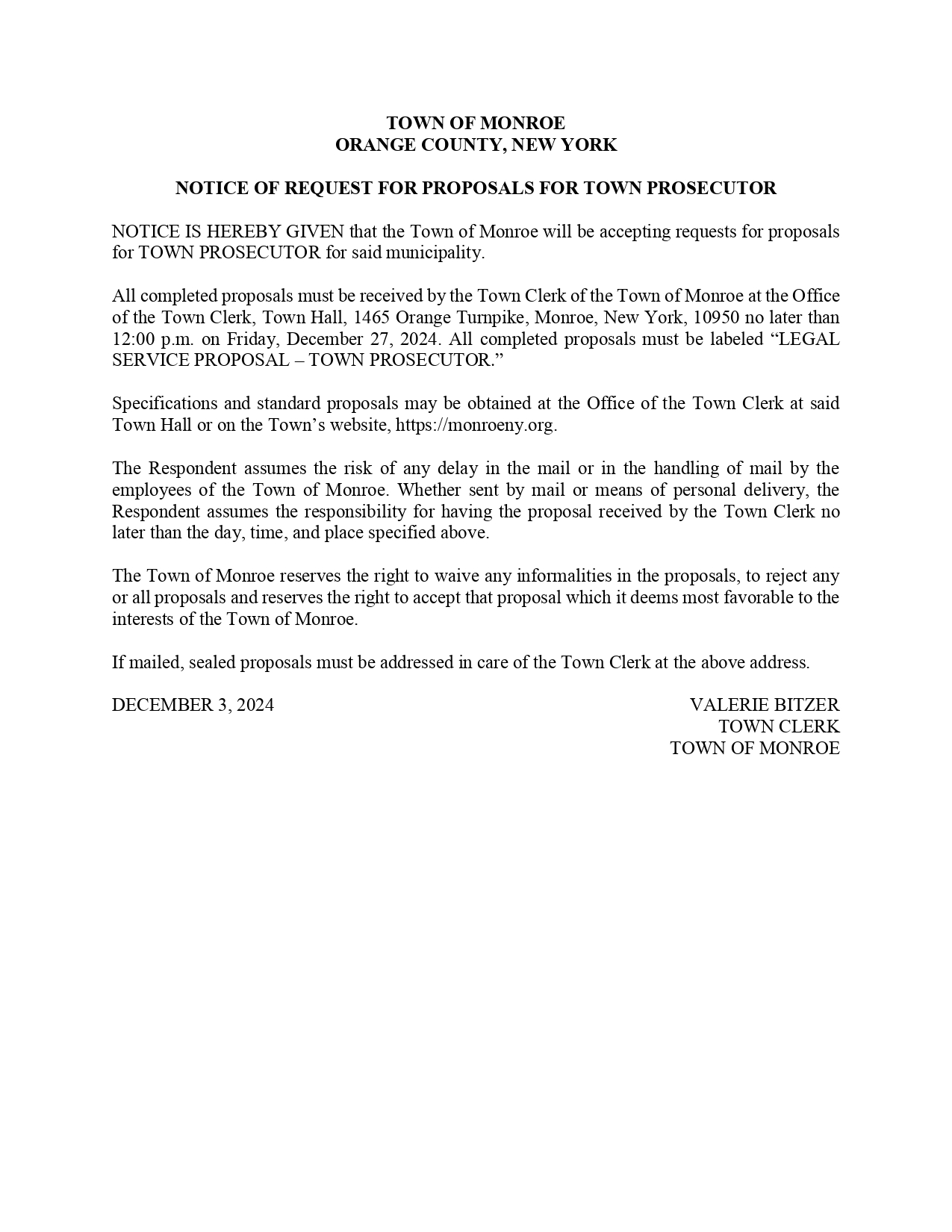 3 December Notice of RFP, Town Prosecutor December 3, 2024 By Town Clerk . Community News, General, Public Notices 0 Notice of RFP, Town Prosecutor Related Articles TOWN OF MONROE NOTICE OF JOINT WORKSHOP MEETING OF THE TOWN BOARD AND TOWN PLANNING BOARD RE: Rye Hill Preserve Master Development Plan NOTICE IS HEREBY GIVEN that a Special Joint Workshop Meeting of the Town Board and Town Planning Board of the Town of Monroe, Orange County, New York, will be held on Wednesday, March 23, 2022 at 6:30 p.m. at the Town Hall, 1465 Orange Turnpike, Monroe, New York to discuss the proposed Rye Hill Preserve Master Development Plan under the Town’s Conservation Cluster Residential Floating Zone (“CCR”). No public comment will be heard at this Joint Workshop Meeting. The Town of Monroe will make every effort to assure that the Meeting is accessible to persons with disabilities. Anyone requiring special assistance and/or reasonable accommodations should contact the Town Clerk. BY ORDER OF THE TOWN BOARD, dated March 18, 2022 Valerie Bitzer TOWN CLERK Notice of Public Hearing to consider the adoption of Introductory Local Law No. A-v1 amending the Town Code of the Town of Monroe requiring utility companies to remove inactive, broken and/or dormant poles within Town boundaries Notice of Public Hearing to consider the adoption of Introductory Local Law No. A-v1 amending the Town Code of the Town of Monroe requiring utility companies to remove inactive, broken and/or dormant poles within Town boundaries. Public Notice: To Consider the Adoption of Local Law C-V1 to Amend Ch. A64 of the Town Code of the Town of Monroe Regarding "Alternate Members" Public Notice: To Consider the Adoption of Local Law C-V1 to Amend Ch. A64 of the Town Code of the Town of Monroe Regarding "Alternate Members" Notice of Bid Invitation RE: Town of Monroe Town Hall HVAC Equipment Replacement Notice of Bid Invitation RE: Town of Monroe Town Hall HVAC Equipment Replacement Notice of Adoption Local Law 9 of 2023 A Local Law to Amend the Town Zoning Map Pursuant to Ch. 57 to Apply the CCR Floating Zone to Certain Parcels in the Town Notice of Adoption Local Law 9 of 2023 A Local Law to Amend the Town Zoning Map Pursuant to Ch. 57 to Apply the CCR Floating Zone to Certain Parcels in the Town Zoning Board of Appeals Public Hearing Notice: The Application of Michael Adams to Receive Six (6) Area Variances for “Lots Abutting a Lake or Stream” November 23, 2021 at 7:30PM, Monroe Town Hall 1465 Orange Tpke., Monroe, NY TOWN OF MONROE ZONING BOARD OF APPEALS NOTICE OF PUBLIC HEARING NOTICE IS HEREBY GIVEN that, pursuant to § 57-63.G of the Code of the Town of Monroe and § 267-a.7 of the NYS Town Law, that the Zoning Board of Appeals of the Town of Monroe, New York, will hold a Public Hearing on the 23rd day of November, 2021 at 7:30 PM, or as soon thereafter as the matter can be heard that day at Monroe Town Hall, 1465 Orange Turnpike, Monroe, NY 10950 on the application of Michael Adams to receive six (6) area variances for “Lots abutting a lake or stream” under Town Code §57-43 and “Accessory buildings and uses” under §57-38. The variances requested are as follows: (1) for a shed minimum setback required 50’ proposed 8’, (2) for a pavilion under §§57-43 and 57-38 minimum setback required 50’ proposed 10’ (3) under §57-38 minimum setback 5’ required proposed 0’ (4) front yard setback 60’ required 15’ proposed 45’, (5) building in the front yard variance needed under Article XI 57-38(c) In any district no private garage or other accessory building or parking area shall be within a required front yard, (6) Northside Shed under 57-43 shoreline setback 50’ required 30’ proposed encroachment 30’. The lands affected by this application are located at 485 State Route 208 in the Town of Monroe and shown generally on the tax maps of the Town of Monroe as Sec. 1, Block 1, Lot 55.111. A copy of the application is available for public inspection at the office of the Zoning Board during regular business hours. The meeting is open to the public. Dated: Monroe, New York November 10, 2021 BY ORDER OF THE ZONING BOARD OF APPEALS TOWN OF MONROE, NEW YORK BY: MICHAEL MURPHY, CHAIRMAN Comments are closed.